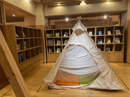 館内にはテントやハンモック絵本などがあるキッズスペースがありました。
